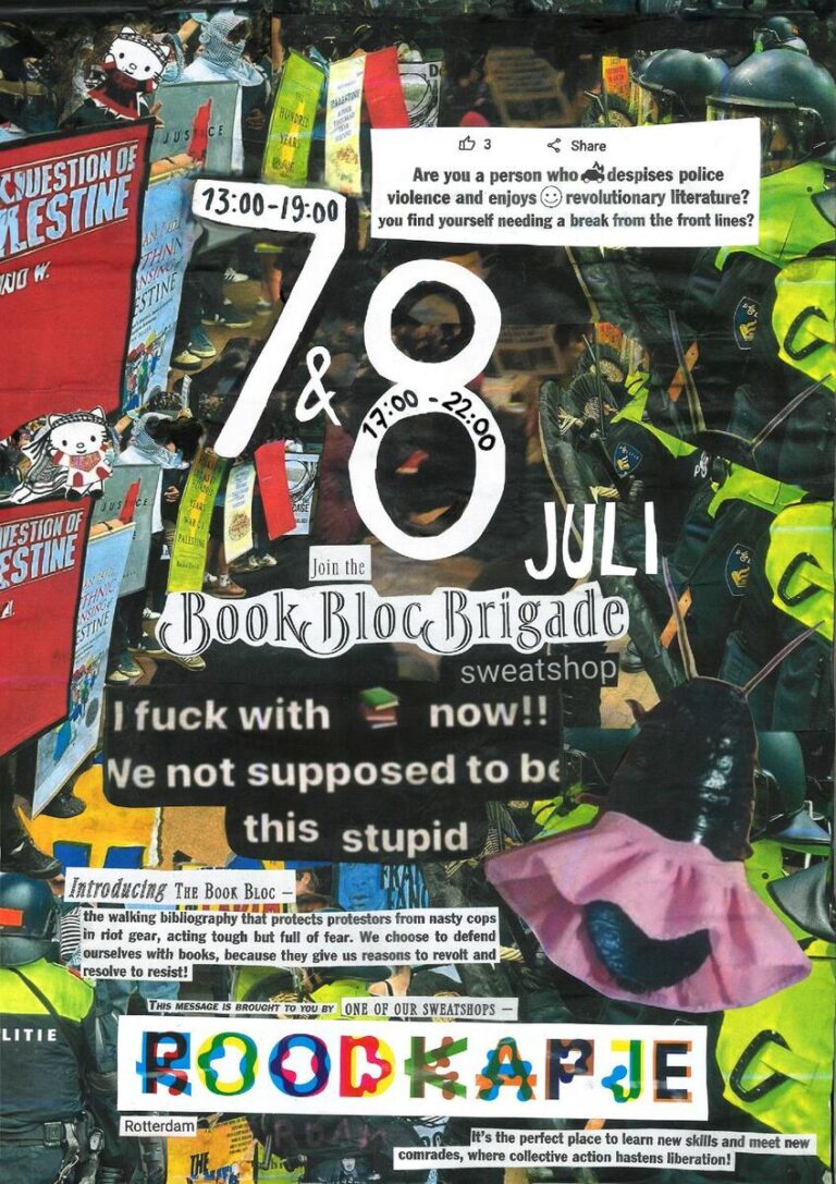 Convened by the Book Bloc Brigade, Roodkapje, Spin Collective and the Zilvervisjes, this #bookbloc sweatshop builds shields mimicking huge books. The Brigade continues to improve the shield design and teaches people how to make them, in order to protect and embolden our comrades in their struggle. The book covers are selected from the growing #bookbloc bibliography. These walking bibliographies protect protesters from police brutality while spreading revolutionary resources on the Palestinian struggle. Afterwards, the shields will be distributed to encampments across the Netherlands. The Bookbloc Sweatshop is also a moment to spend time with our comrades, recover from the frontlines, and for those who can’t join the frontlines to contribute to the movement.