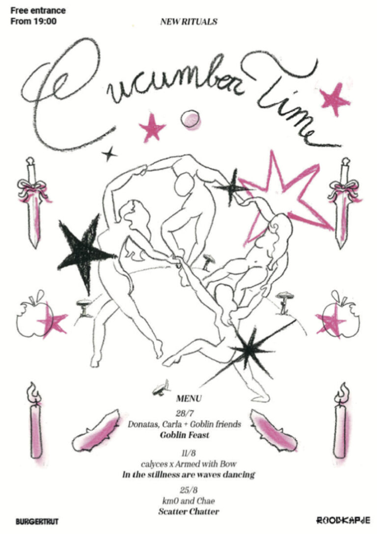 After last year’s Cucumber Time we’re back again with a new series of performances in Burgertrut every other Sunday in July & August with the theme “rituals”, brought to you by Carla Menas, Jip Moeken, Paul Mullenberg, Chris Nelck, calyces, armedwithbow, Riviera Taylor, km0 and Chae.