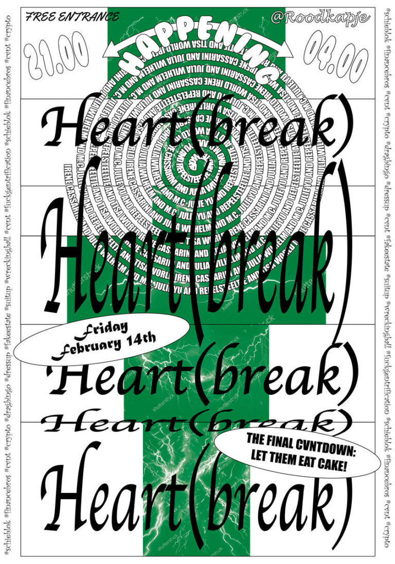The end of an era is approaching: on our favourite day of the year we will host the final event of the 2024 Hamburger Community. Although our hearts will ache, we are ready to welcome a rave new world. Come dressed up as your favourite crypto bro, realtor, or wealthy heir eager to get rid of excessive cash. In this absurdist parody of the grim reality around us, we will metaphorically smash the city and teach you how to make money fast in five easy steps. The phoenix will rise from its ashes. LET THEM EAT CAKE! And we will…Expect drag bingo, music, a ‘best realtor’ dress up cvntest and a fundraiser raffle. Plus bubbles, fun and a final surprise. Cry, rage, love and rave with us!