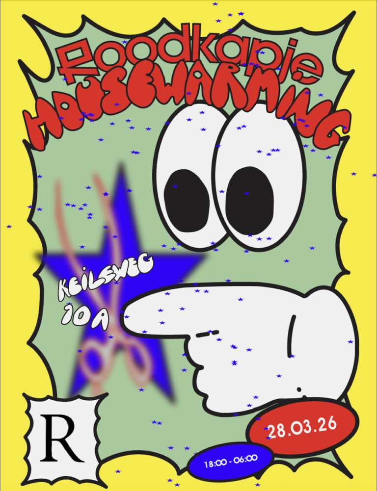 Important: Roodkapje’s housewarming starts at 18:00 with 3 hours of free entry. The RAW Afterparty begins at 21:00, and entry from that time is ticketed only.