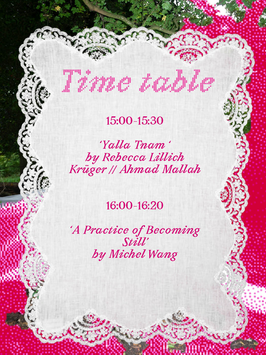 Through voice, sound, and movement, Ahmad Mallah and Rebecca Lillich // Krüger invite the audience into a moment of collective mourning and transformation. The performance interweaves Fairuz’s lullaby "Yalla Tnam" with Syrian grief rituals that emerged during the early years of the Syrian Revolution.